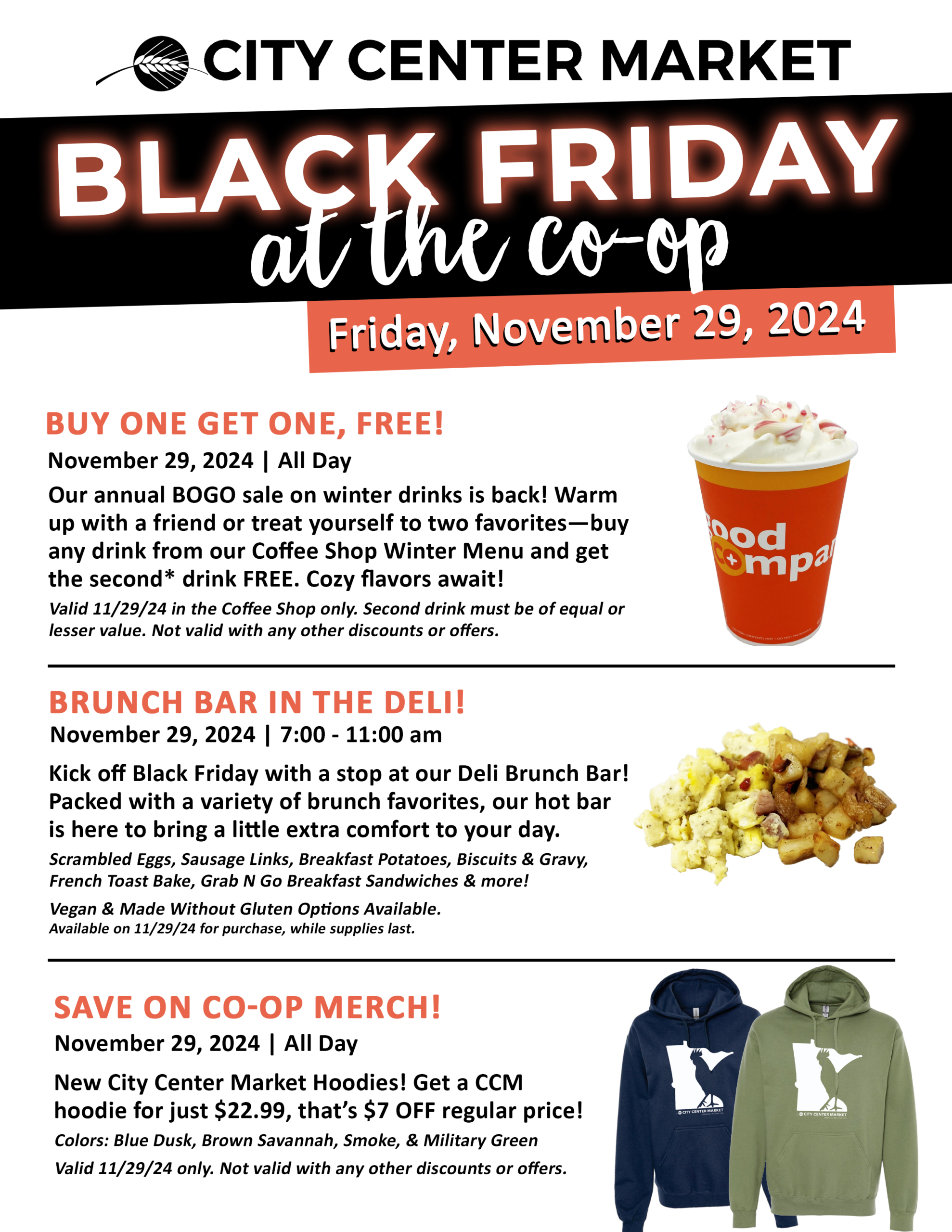 Kick off Black Friday with a stop at our Deli Brunch Bar! Packed with a variety of brunch favorites, our hot bar is here to bring a little extra comfort to your day. Scrambled Eggs, Sausage Links, Breakfast Potatoes, Biscuits & Gravy, French Toast Bake, Grab N Go Breakfast Sandwiches & more! Vegan & Made Without Gluten Options Available. Available on 11/29/24 for purchase, while supplies last.
