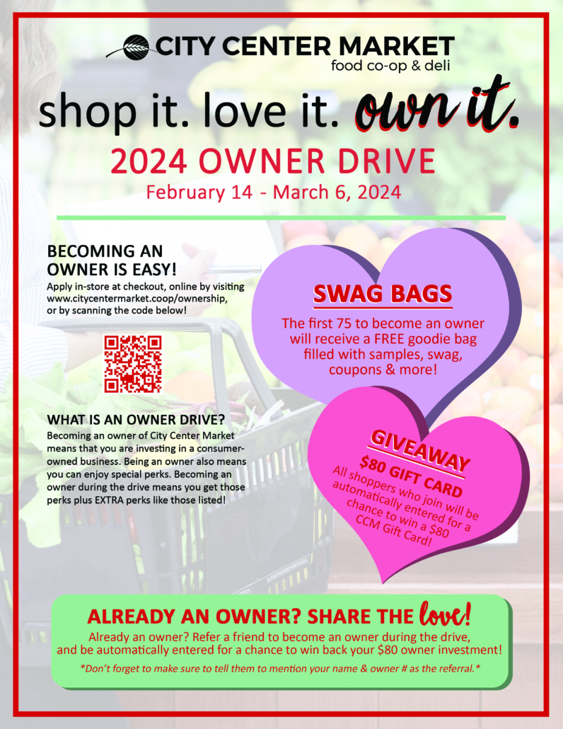Becoming an owner of City Center Market means that you are investing in a consumer-owned business. Being an owner also means you can enjoy special perks. Becoming an owner during the drive means you get those perks plus EXTRA perks like those listed!