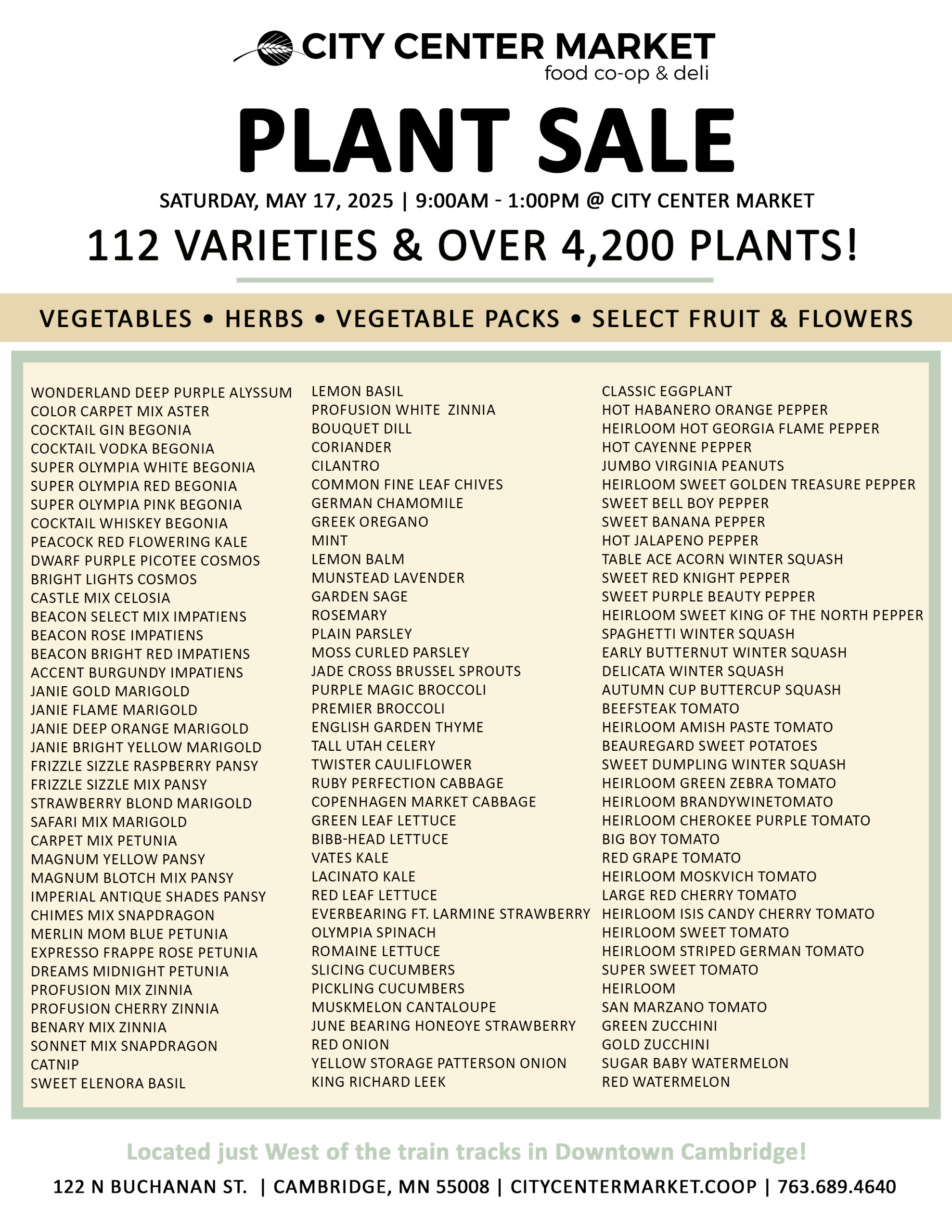 Join us for our 2025 Fourth Annual Plant Sale! We are offering 112 varieties and over 4,200 plants! These plants are Minnesota Native Vegetable, Fruit and Herb Plant Starts from Glacial Ridge Growers. Glacial Ridge Growers in a Non-GMO grower and neonic-free producer.