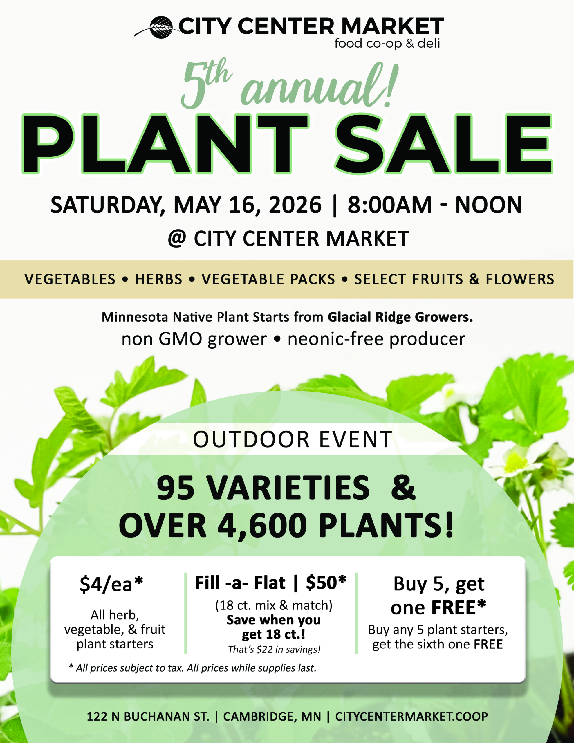 Join us for our 2026 Fifth Annual Plant Sale! We are offering 95 varieties and over 4,600 plants! These plants are Minnesota Native Vegetable, Fruit and Herb Plant Starts from Glacial Ridge Growers. Glacial Ridge Growers in a Non-GMO grower and neonic-free producer.