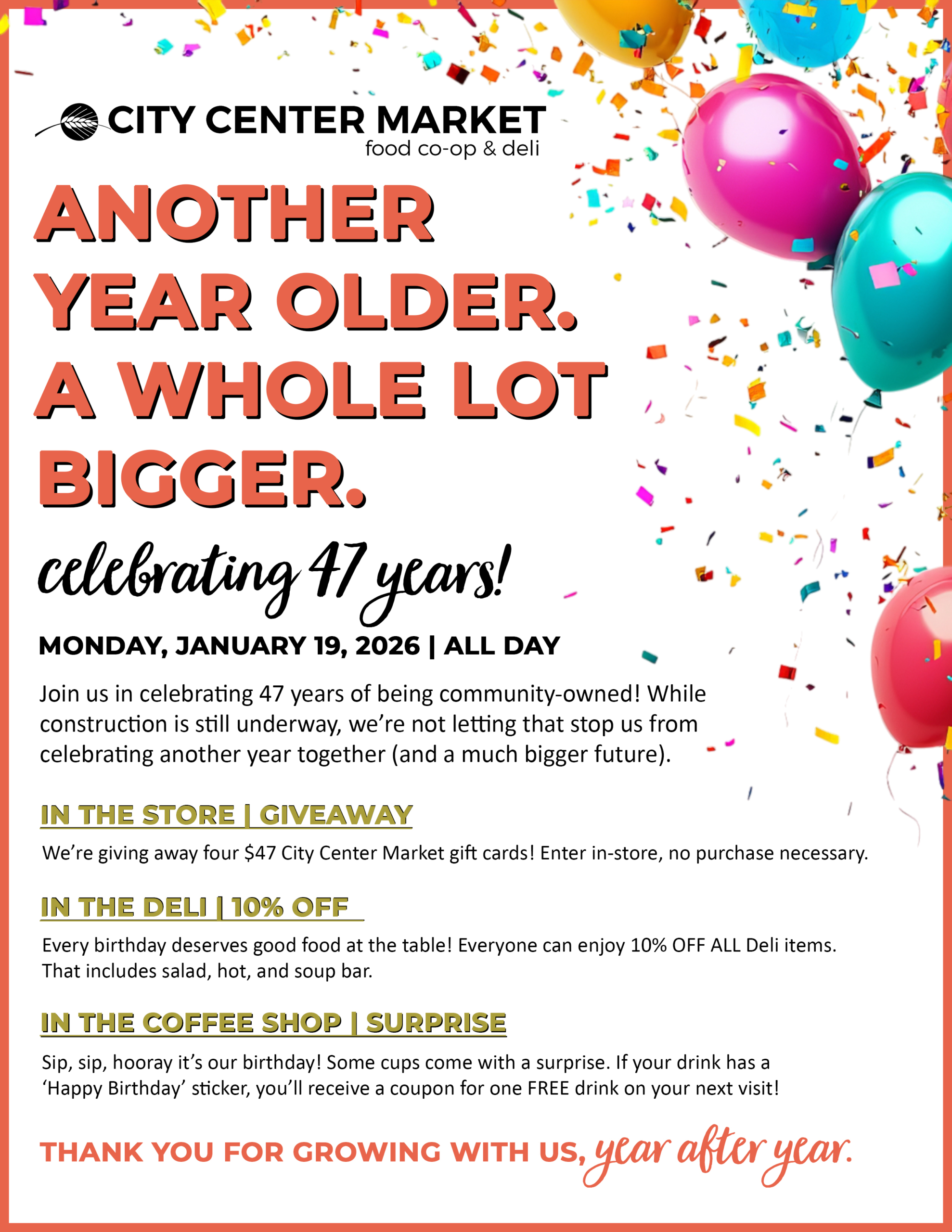 We’re celebrating 47 years of being community-owned! While construction is still underway, we’re not letting that stop us from celebrating another year together (and a much bigger future).