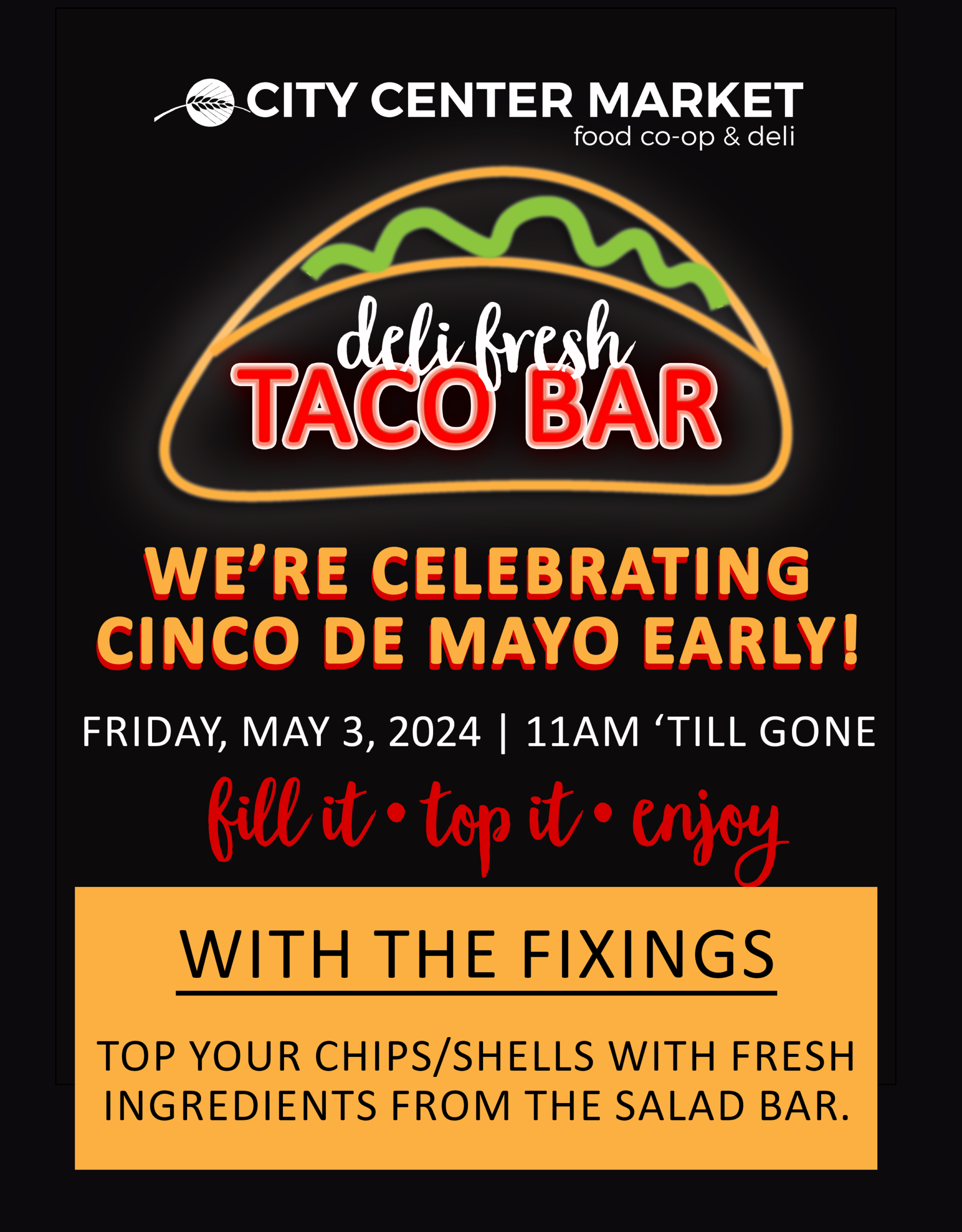 Join us at City Center Market to celebrate Cinco de Mayo a little bit early with a Taco Bar in our Deli.