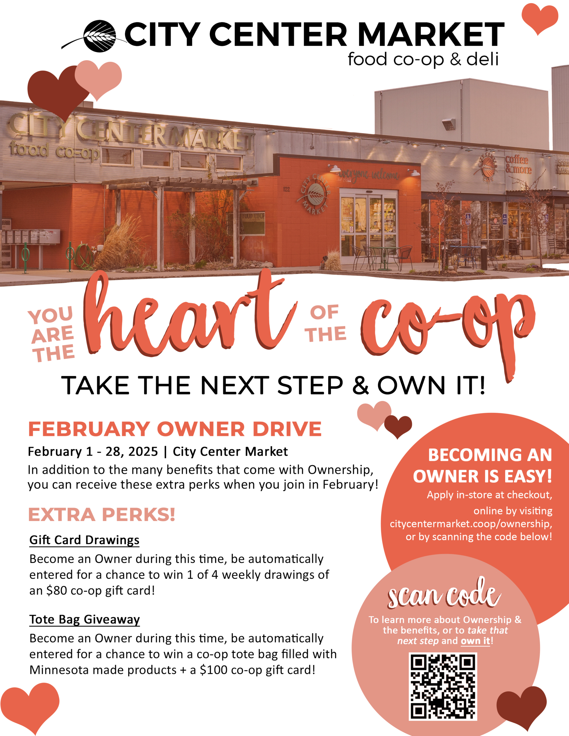 Become an Owner during this time, be automatically entered for a chance to win a co-op tote bag filled with Minnesota made products + a $100 co-op gift card!
