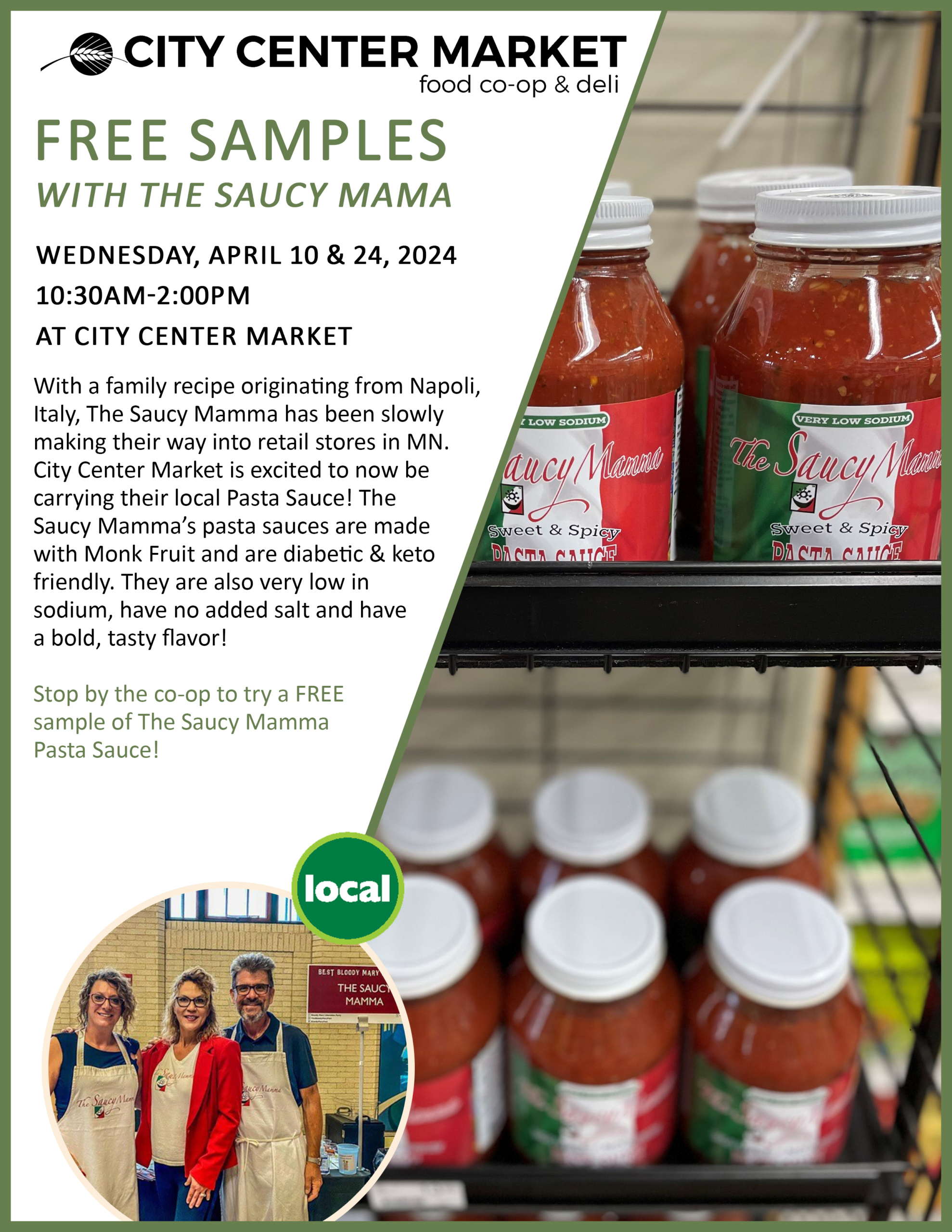With a family recipe originating from Napoli, Italy, The Saucy Mamma has been slowly making their way into retail stores in MN. City Center Market is excited to now be carrying their local Pasta Sauce! The Saucy Mamma’s pasta sauces are made with Monk Fruit and are diabetic & keto friendly. They are also very low in sodium, have no added salt and have a bold, tasty flavor! Stop by the co-op to try a FREE sample of The Saucy Mamma Pasta Sauce!