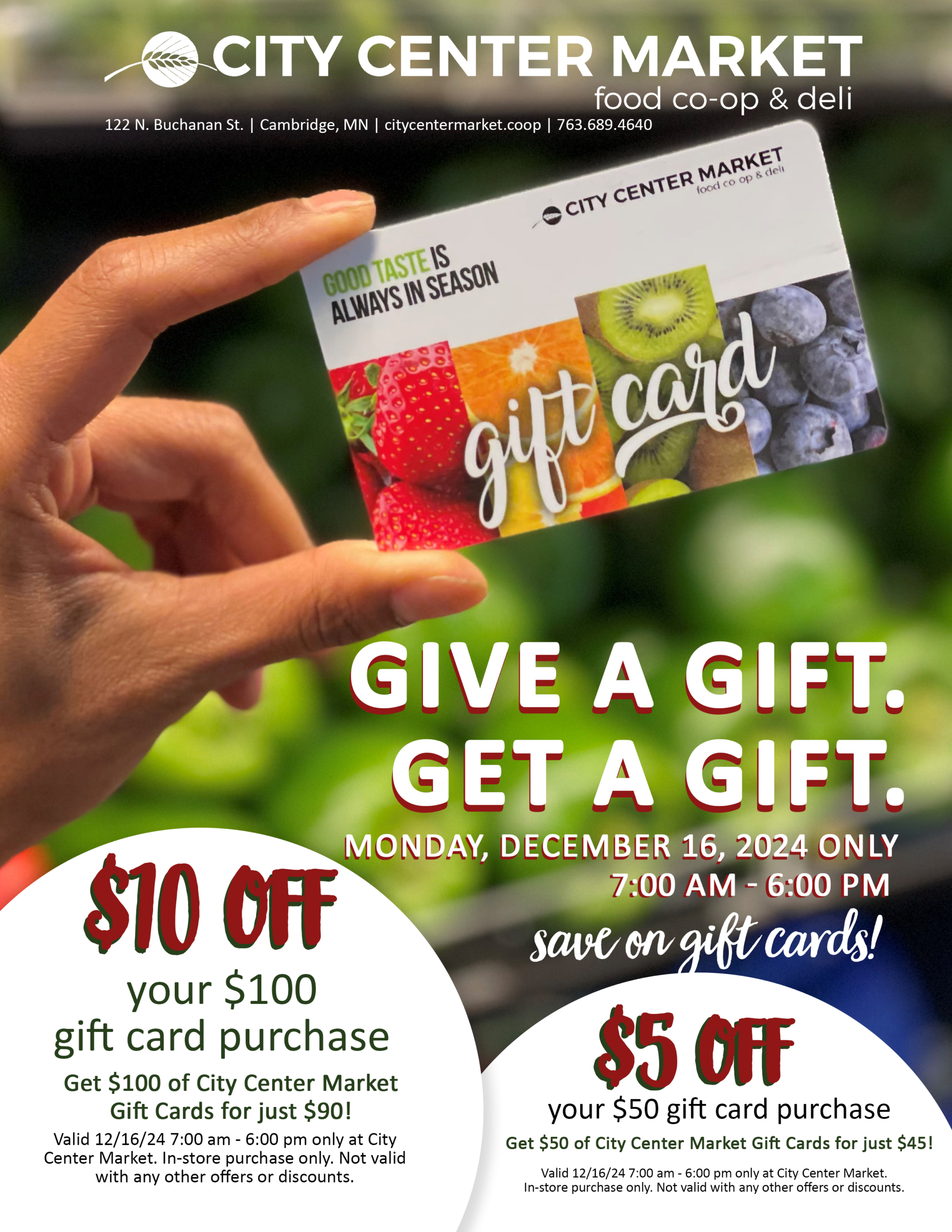 Offers valid 12/16/24 7:00am – 6:00pm only at City Center Market. In-store purchase only. Not valid with any other offers or discounts.
