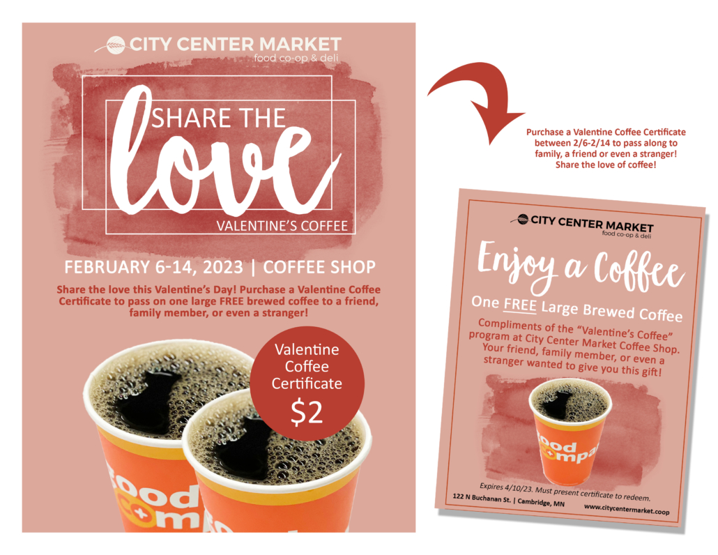 Share the love this Valentine’s Day! Purchase a Valentine Coffee Certificate, between 2/6/23 -2/14/23, to pass along one large FREE brewed coffee to a friend, family member, or even a stranger!