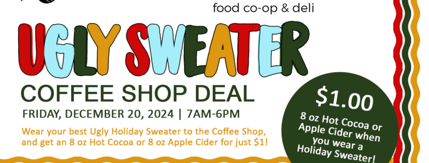 Wear your best Ugly Holiday Sweater to the Coffee Shop, and get an 8 oz. Hot Cocoa, or 8 oz. Apple Cider for just $1!