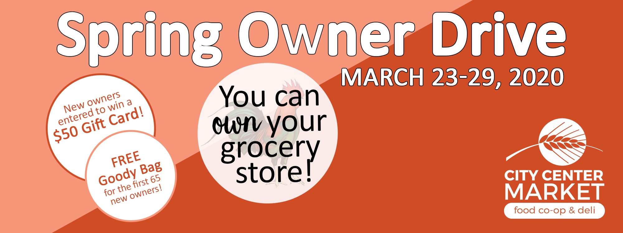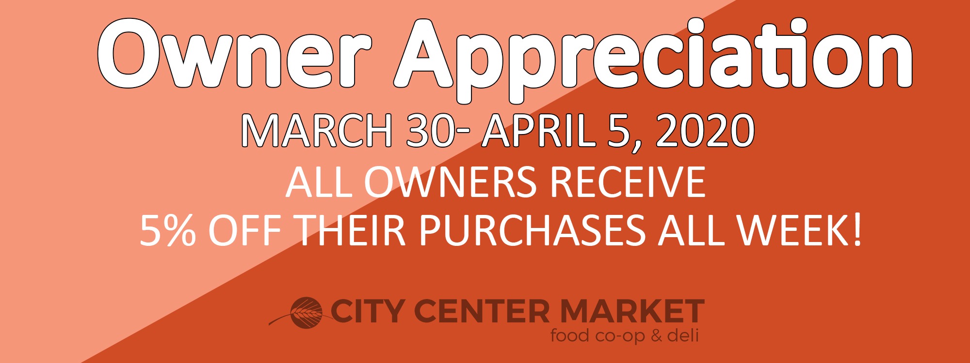 Owner Appreciation Week at City Center Market All owners receive 5% off their purchases all week! Thank you for supporting your co-op!