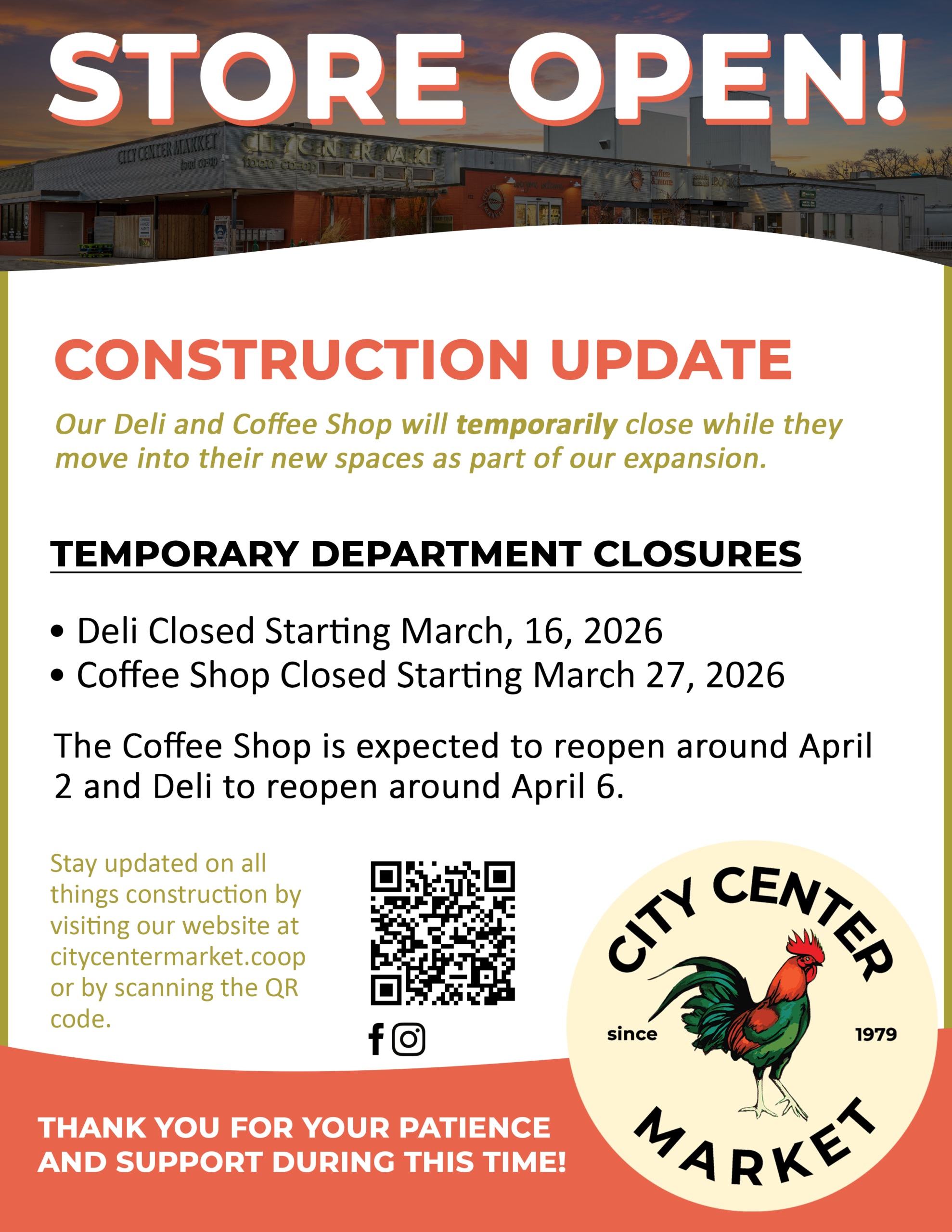 As part of our expansion project, two of your favorite departments are getting ready to move into their brand-new spaces! To make this transition, the Deli and Coffee Shop will temporarily close while they move into their new spaces.